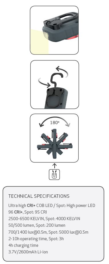 ■ 튼튼한 후크 또는 강력한 내장 자석. 유연한 램프 헤드는 최대 180도까지 기울여집니다.