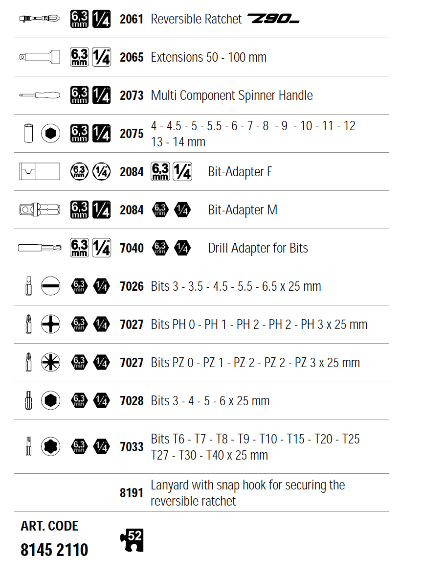 6.3mm (1/4") 규격의 Z90을 포함한 범용 공구 세트