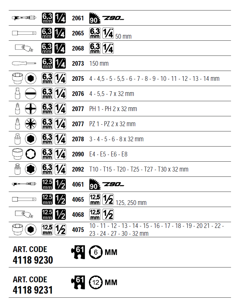 - 12각 소켓 : 10 / 11 / 12 / 13 / 14 / 15 / 16 / 17 / 18 / 19 / 20 / 21 / 22 / 23 / 24 / 27 / 30 / 32 mm