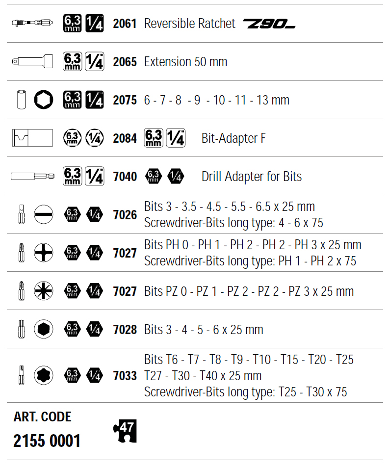• 소켓 렌치, 연장봉, 비트 홀더, 짧고 긴 비트 등