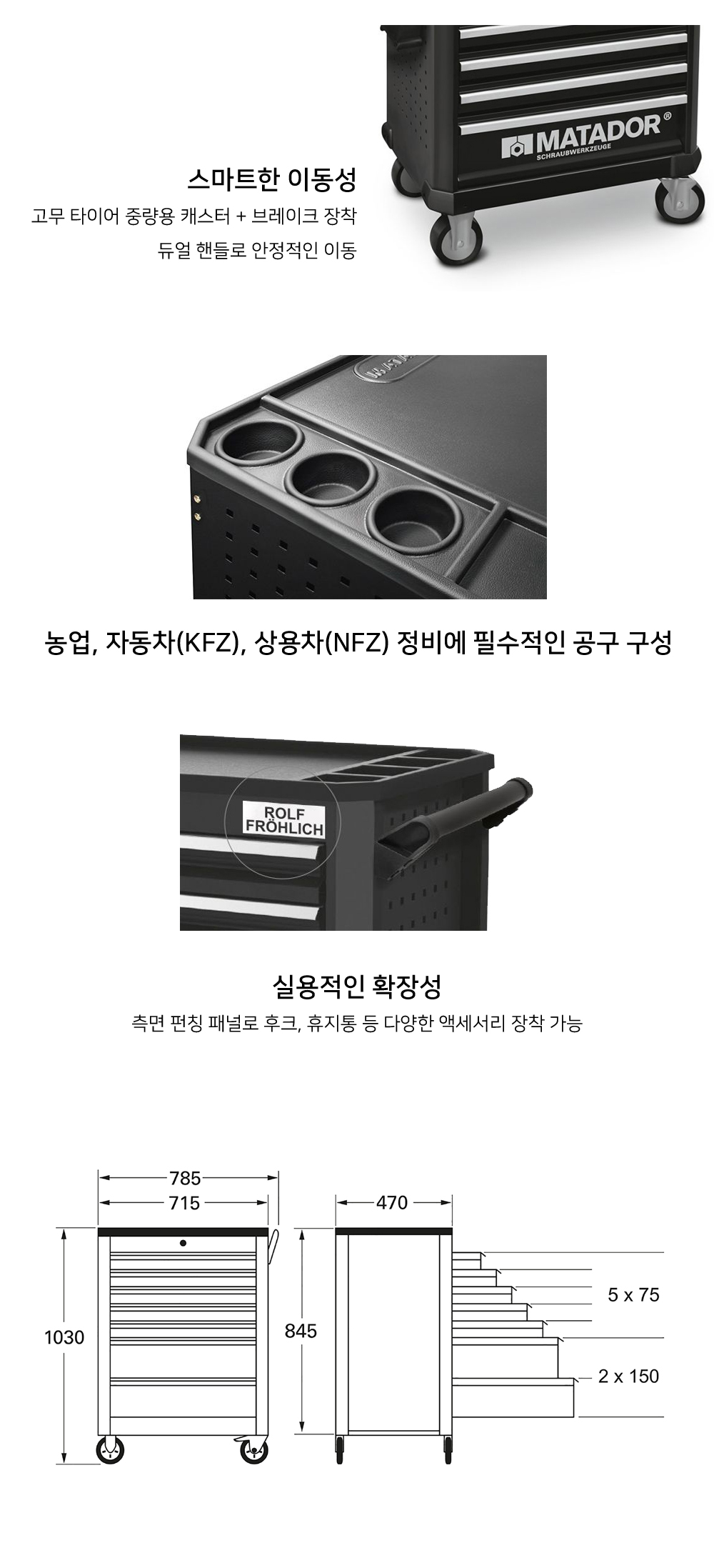 - 3중 안전 잠금 시스템: 중앙 잠금, 개별 서랍 잠금, 동시 개방 방지